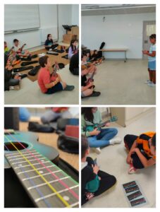 A sisè, continuem el projecte del curs passat, i estem aprenent a llegir en tabulatura, acords més complexos. Coneixen més l’instrument però encara ens queden moltes coses per aprendre i descobrir.