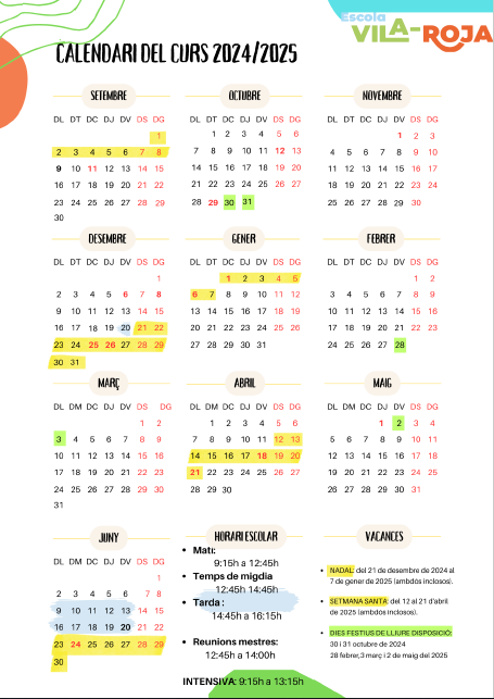 L’horari lectiu del centre és de 9:15 a 12:45 h i de 14:45 a 16:15 h per a tots els alumnes del centre. El dia 20 de desembre de 2024 i a partir del 9 de juny de 2025 es realitza horari compactat de 9:15 a 13:15h. (Els alumnes que utilitzen el servei de menjador surten a les 15:15h).