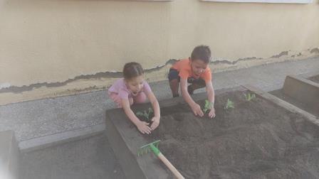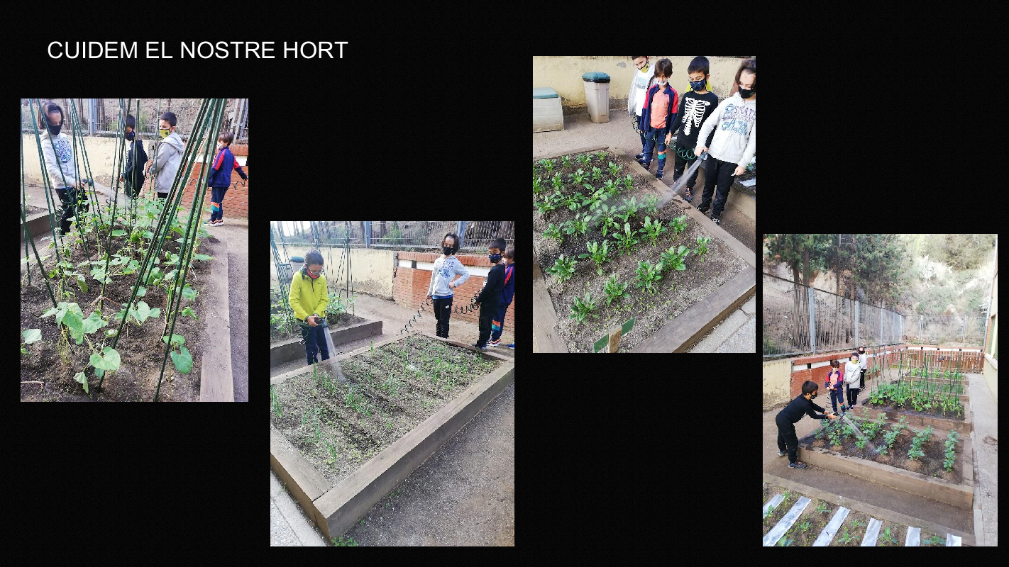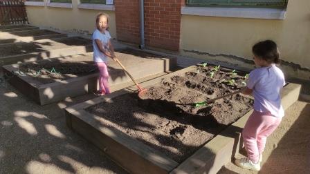 Han tingut molta feina en remenar la terra que estava força seca. Però s’han esforçat molt i l’han preparada molt bé. Seguidament, han fet els solcs, han plantat els planters, han tirat l’humus i finalment han regat.