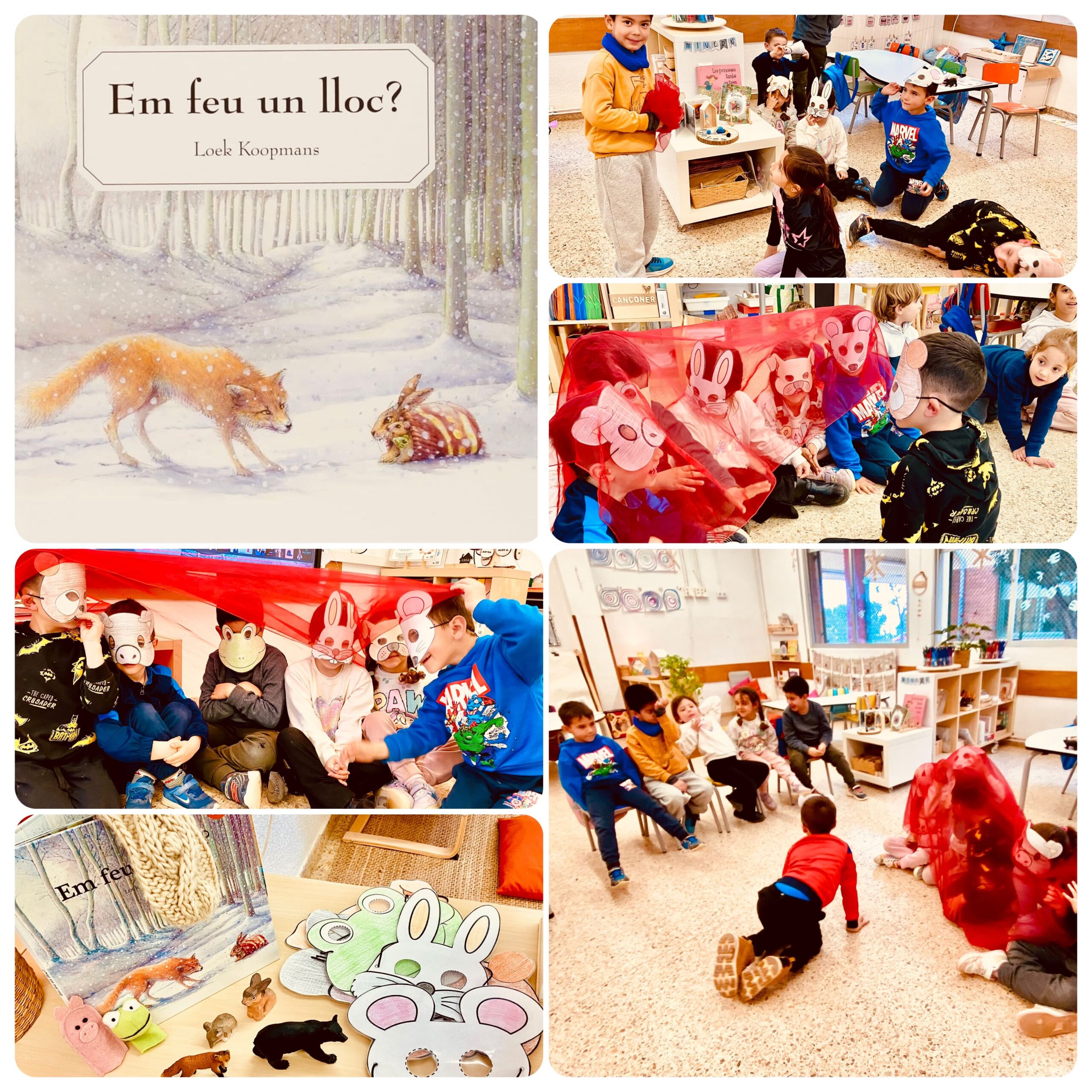 Aquestes setmanes, els infants d’I5 hem descobert l’entranyable conte: “Em feu un lloc?” de Loek Koopmans basat en un conte popular rus/ucraïnès, que narra la història de sis animalons del bosc que busquen un lloc calent per refugiar-se del fred hivernal. Ens ensenya valors com la solidaritat, l’amistat i el compartir. Hem aprofitat que la seva narrativa combina la rima amb frases repetitives per fer un treball de llenguatge verbal a través de la representació teatral del conte.