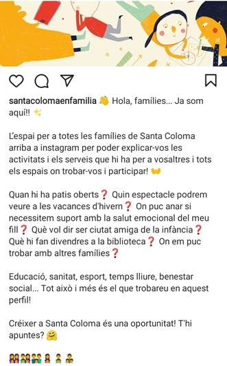 Benvolgudes, benvolguts, Us informem que l’ajuntament ha obert un compte d’Instagram per a les famílies de la ciutat: SantaColomaenfamília Hi trobareu informació sobre activitats, serveis i espais de trobada per a les famílies de Santa Coloma.