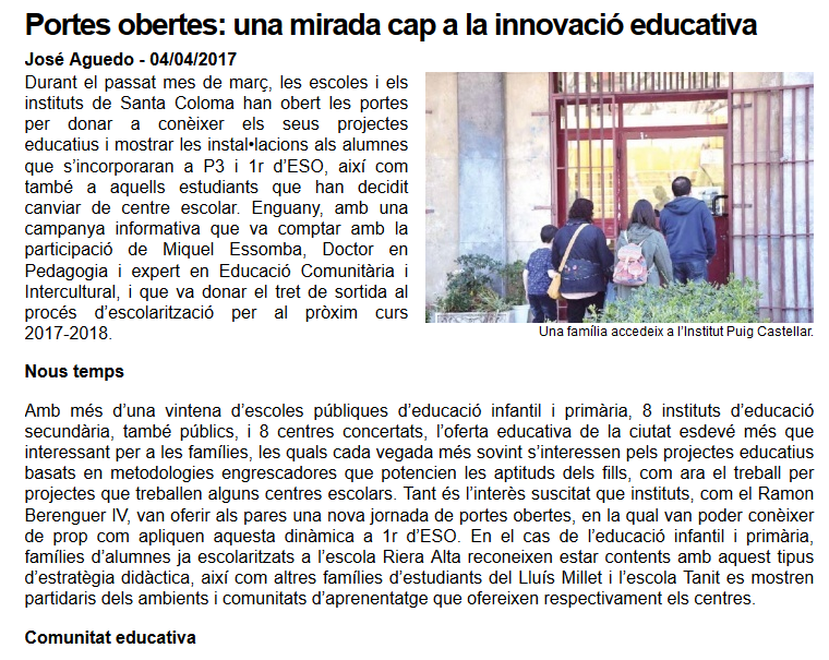 Artícle publicat a al DIARI DE SANTA COLOMA sobre la preinscripció i les jornades de portes obertes.
