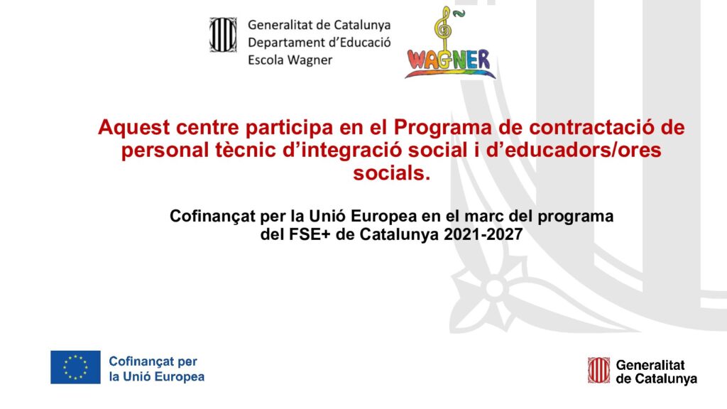 El centre Escola Wagner disposa de professionals d’atenció educativa amb la finalitat de garantir l’equitat en l’accés a l’educació: tècnic/a d’integració social i educador/a social. La contractació d’aquest professional està cofinançada en un 40 % per la Unió Europea i la resta pel Departament d’Educació i Formació Professional, fet que comporta complir unes mesures de […]