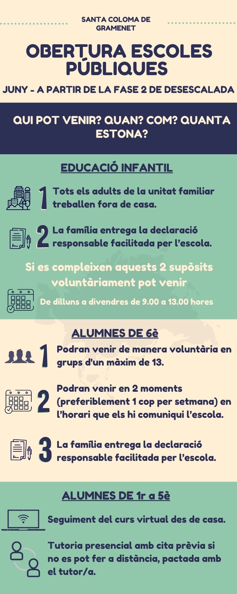 Us passem la informació relativa al pla d’obertura dels centres públics de Santa Coloma de Gramenet, el pla d’obertura de la nostra escola i els fulls de declaració responsable.