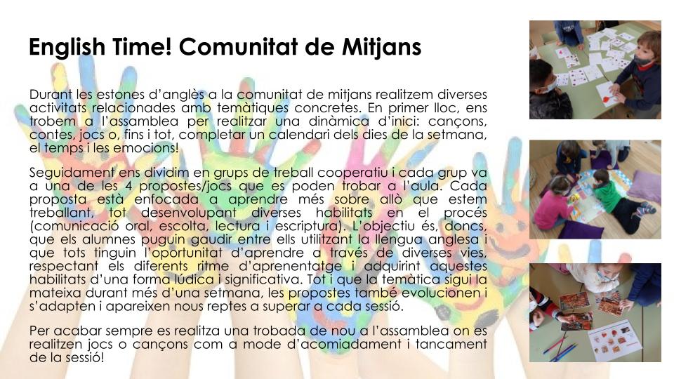Aquí trobareu un petit tast de les propostes que duem a terme a la Comunitat de Mitjans. És l’estona en què els infants aprenen de forma manipulativa, autònoma i atractiva els apectes més curriculars, sempre amb l’acompanyament de la mestra.