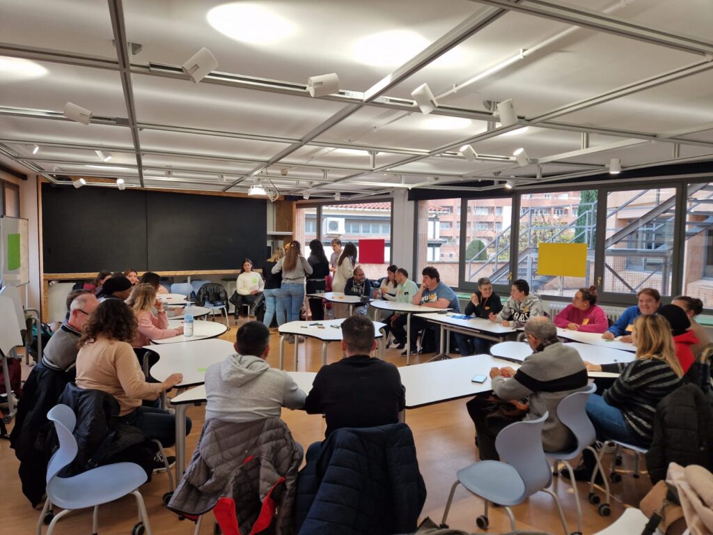 Aquest 12 de desembre, l’alumnat dels estudis post-obligatoris del CFA Carme Karr ha estat convidat pels alumnes d’Educació Social de la Universitat de Vic per col·laborar en una taula rodona juntament amb membres de la fundació Sant Tomàs d’Osona, associació que treballa donant suport a les persones amb discapacitat intel·lectual de la comarca. Els estudiants de la uVIC han preparat una proposta lúdica on els diferents col·lectius han pogut compartir debilitats i fortaleses amb les que s’han anat trobant en diferents aspectes de la seva vida i, conjuntament, hem buscat estratègies per afavorir la inclusió en la nostra vida quotidiana. Abans de la sessió els nostres alumnes han pogut visitar les instal·lacions de la uVIC i endinsar-se en la vida universitària: han pogut participar d’una sessió radiofònica improvisada, veure les aules hospitalàries simulades i, fins i tot, fer el tafaner en un taller d’exploració de gustos o de creació de nous materials per alumnat d’infantil i primària. Ha sigut una experiència d’allò més enriquidora!