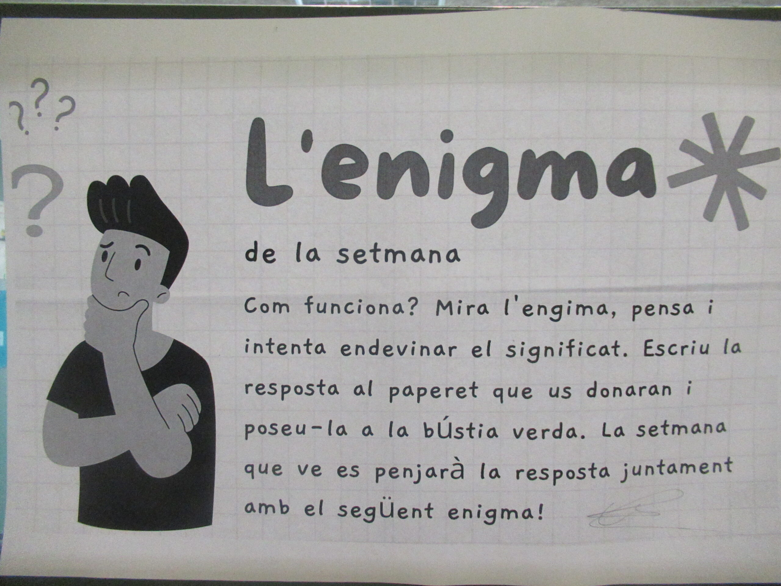 Durant aquest últim trimestre hem tingut una nova proposta per a l’alumnat, el racó de l’enigma de la setmana. Cada setmana, en un punt concret del passadís hi ha penjat un enigma en forma de jeroglífic en català. Els alumnes poden respondre a través d’unes butlletes que es dipositen a una bústia. Entre els encertants, es fa un sorteig setmanal d’un lot de regals.