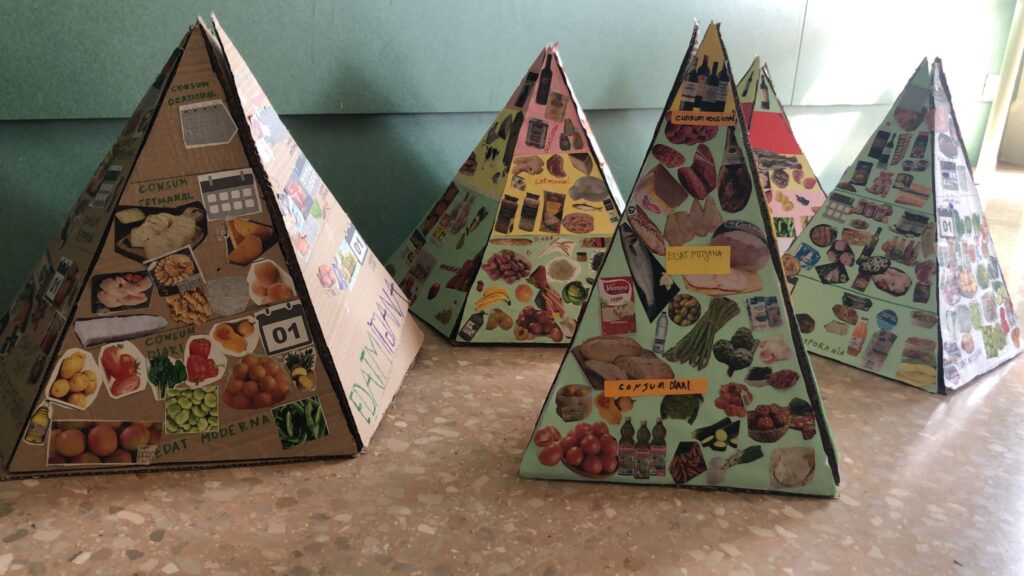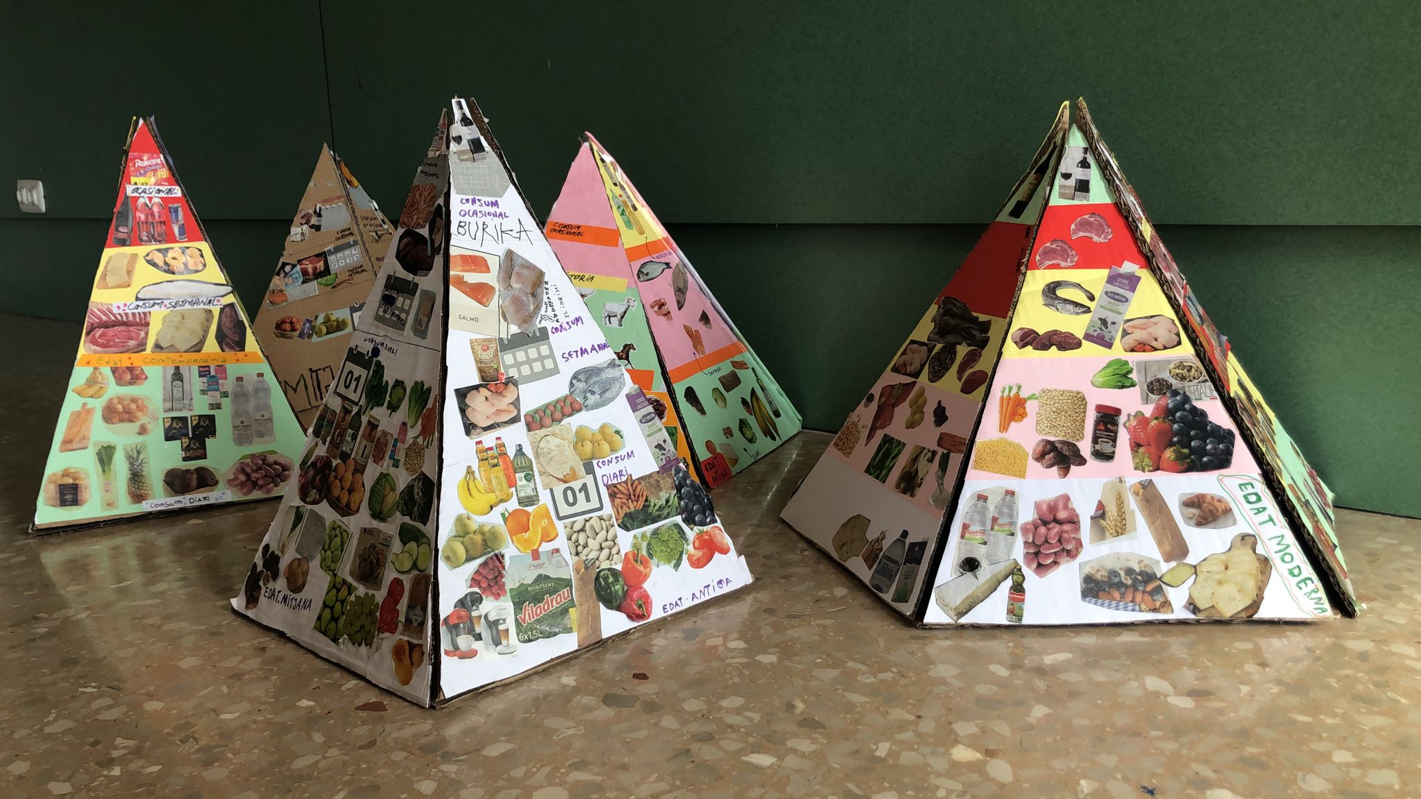 El segon projecte “Alimentem-nos de la història” forma part del projecte d’Aprenentatge i Servei, on estudiants del grau de magisteri d’educació primària en menció en Educació Inclusiva i Atenció a la Diversitat de la UVic-UCC ens preparen una programació d’un tema concret i nosaltres la portem a terme. En aquest, hem estat aprenent sobre els diferents aconteixements i etapes de la història, així com l’arribada dels diferents aliments que mengem a dia d’avui. La tasca final va consistir en realitzar una piràmide, l’alumnat havia de tenir en compte quins aliments hi havia en una etapa concreta i fer una piràmide dels aliments considerant quins d’aquests aliments existien i si eren més o menys saludables independentment de si aquests aliments es consumien molt seguidament o de manera ocasional. Això ens va permetre reflexionar sobre alguns aliments o begudes que sovint es consumeixen o s’han consumit diariament però per diferents motius no vol dir que siguin saludables. Us deixem algunes fotos dels resultats finals dels diferents grups: