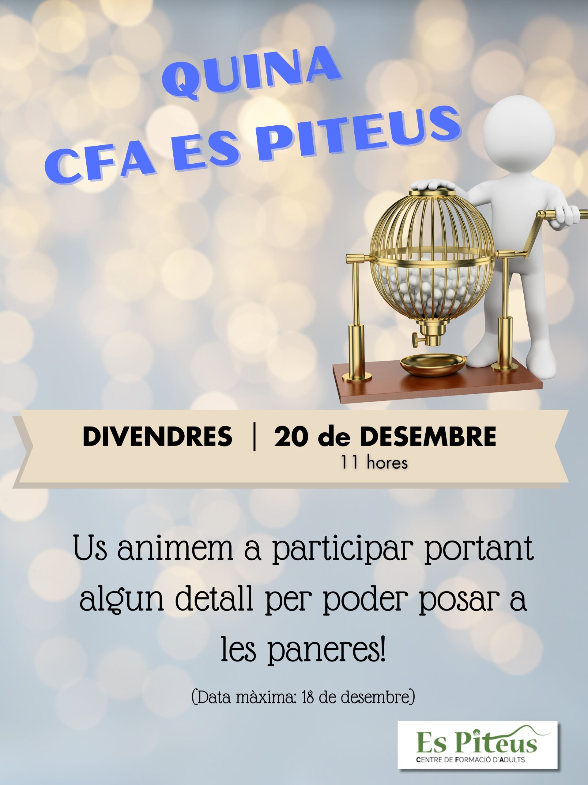 QUINA DE NADAL admin04/12/24 El proper divendres 20 de desembre, a les 11h, farem una súper quina! Les paneres estaran formades per detalls que portin els mateixos alumnes. Us hi esperem!