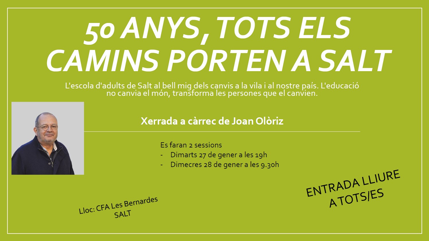 Enguany l’Escola d’Adults de Salt compleix 50 anys, un esdeveniment memorable. L’any 1975 en plena transició democràtica, mentre la societat bullia per tots cantons per aconseguir la llibertat robada, a Salt i Girona tenien lloc dues experiències que sembrarien l’embrió de les futures escoles d’adults. Aquestes primeres experiències gironines a l’educació permanent d’adults (EPA) buscaven […]