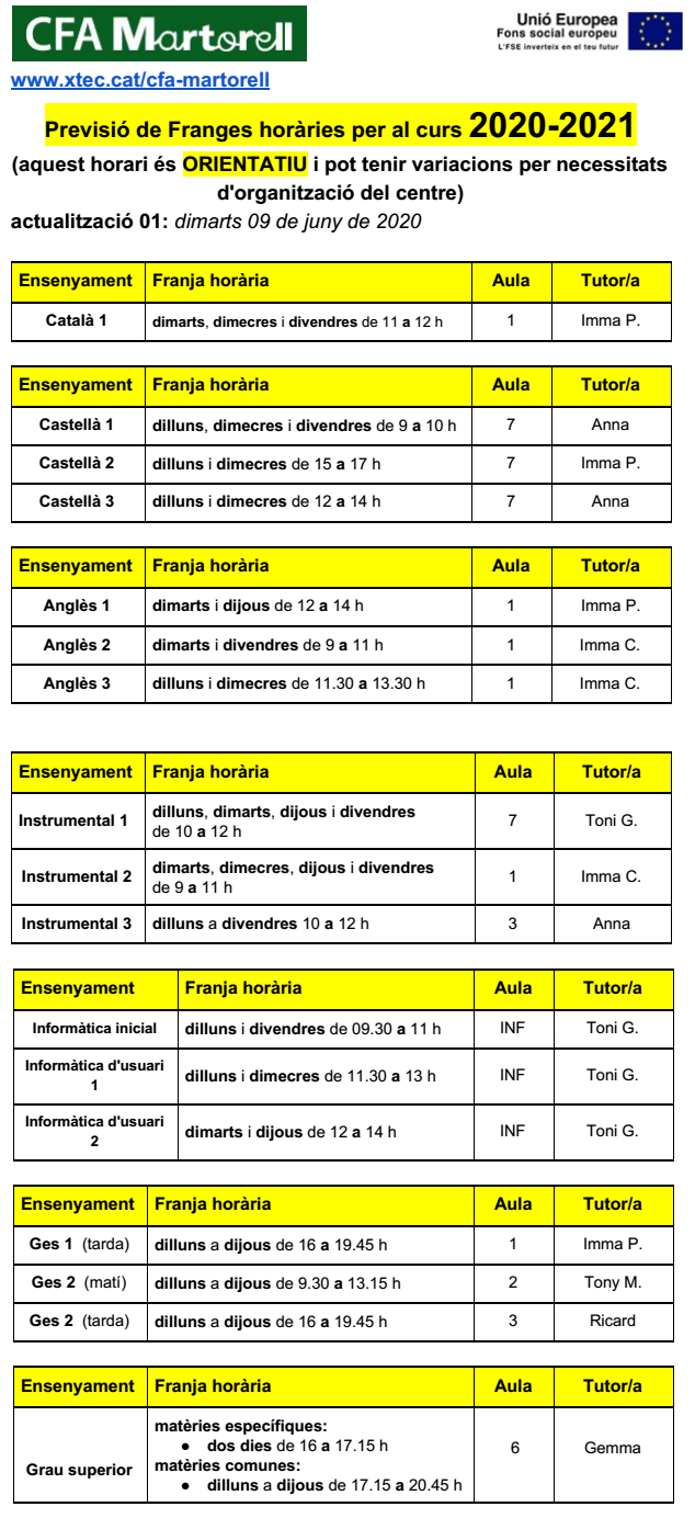 informació referent a aquest procés de preinscripció per al curs 2020-2021: oferta formativa, previsió de franges horàries (matí o tarda)…