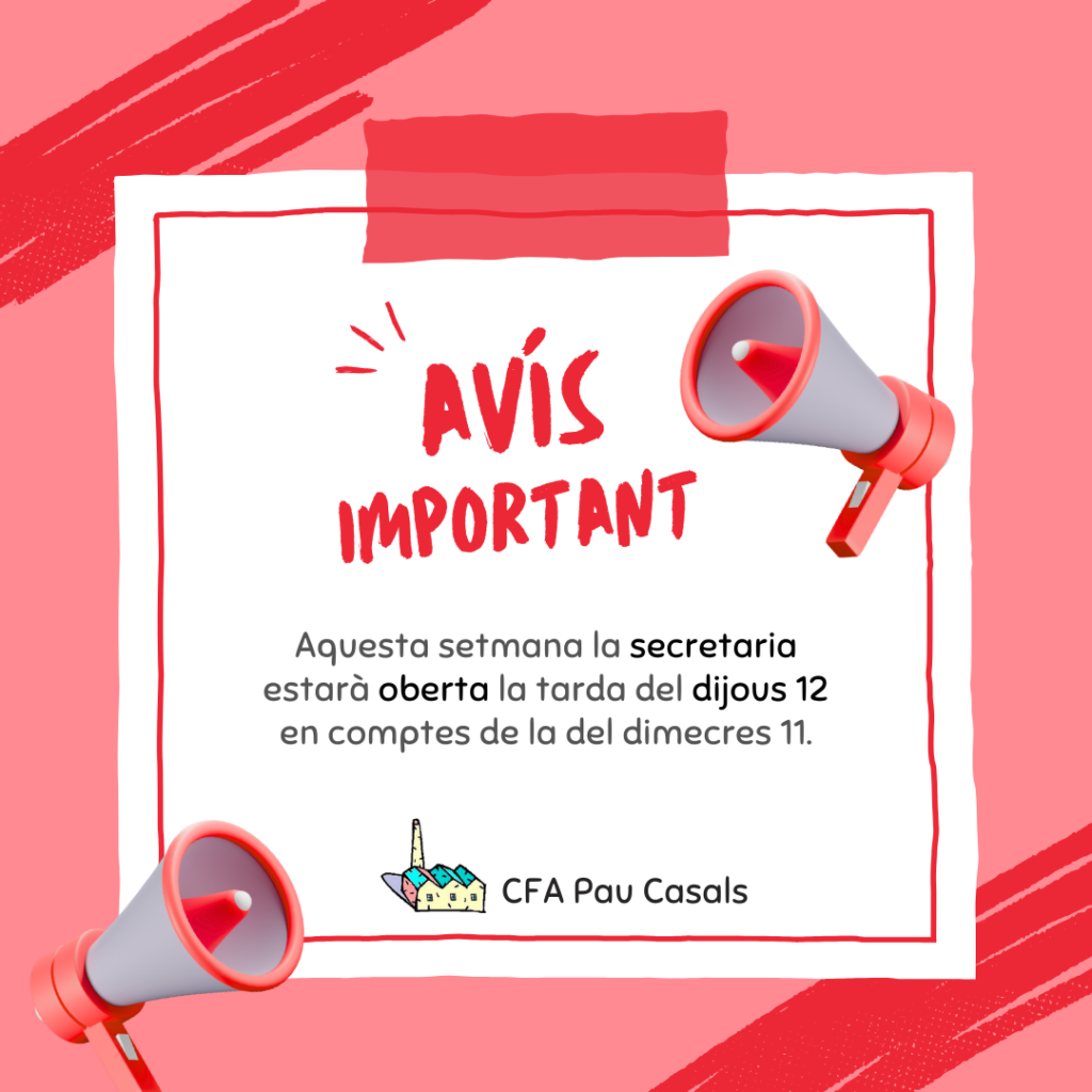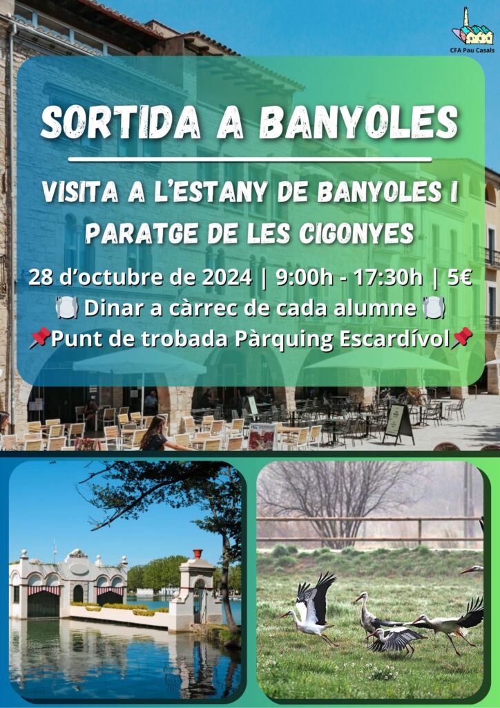 Sortida de cohesió adreçada a tot l’alumnat del CFA Pau Casals. El proper 28 d’octubre anirem a visitar l’estany de Banyoles. Sortim a les 9 des de l’Escardívol en autocar. Farem una visita guiada i tindrem una estona de temps lliure. Us podeu endur el vostre dinar o fer una reserva en un restaurant. La tornada està prevista per les 17:30. Si vols anar-hi, apunta’t a la teva tutoria i passa’t per secretaria a abonar 5€ de l’inscripció.