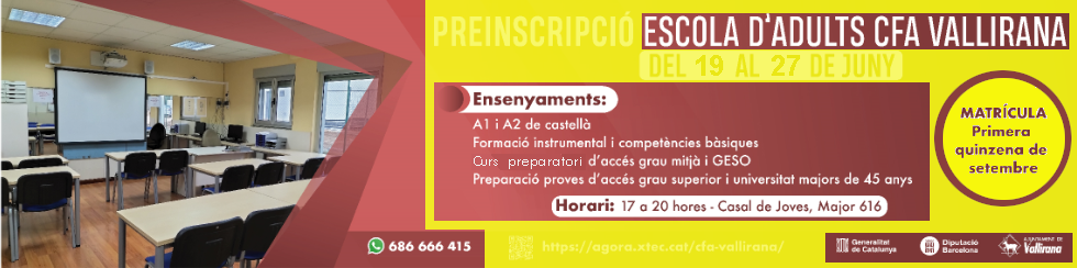 Podeu ampliar la informació sobre els ensenyaments que oferim en aquest enllaç: https://agora.xtec.cat/cfa-vallirana/ensenyaments/