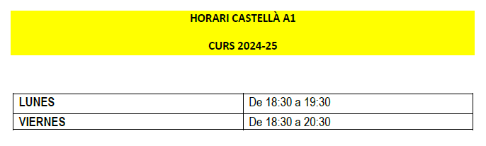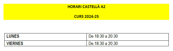 Horaris Grups A1 i A2 Llengua espanyola Horari dels Cursos de Llengua espanyola (nivells A1 i A2). (Última actualització: 20/09/2025)
