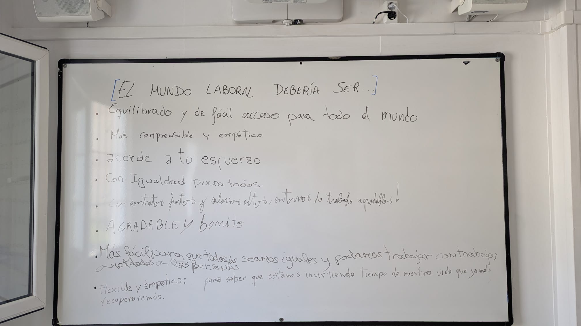 En la sessió d’avui, hem tancat l’assignatura amb una activitat col·lectiva de reflexió. A partir de la frase “el món laboral hauria de ser…”, cada alumne/a ha pogut expressar la seva mirada i compartir-la amb el grup. Les respostes, recollides a la pissarra, mostren una visió diversa però amb punts en comú: la necessitat d’un món laboral més just, accessible i digne.