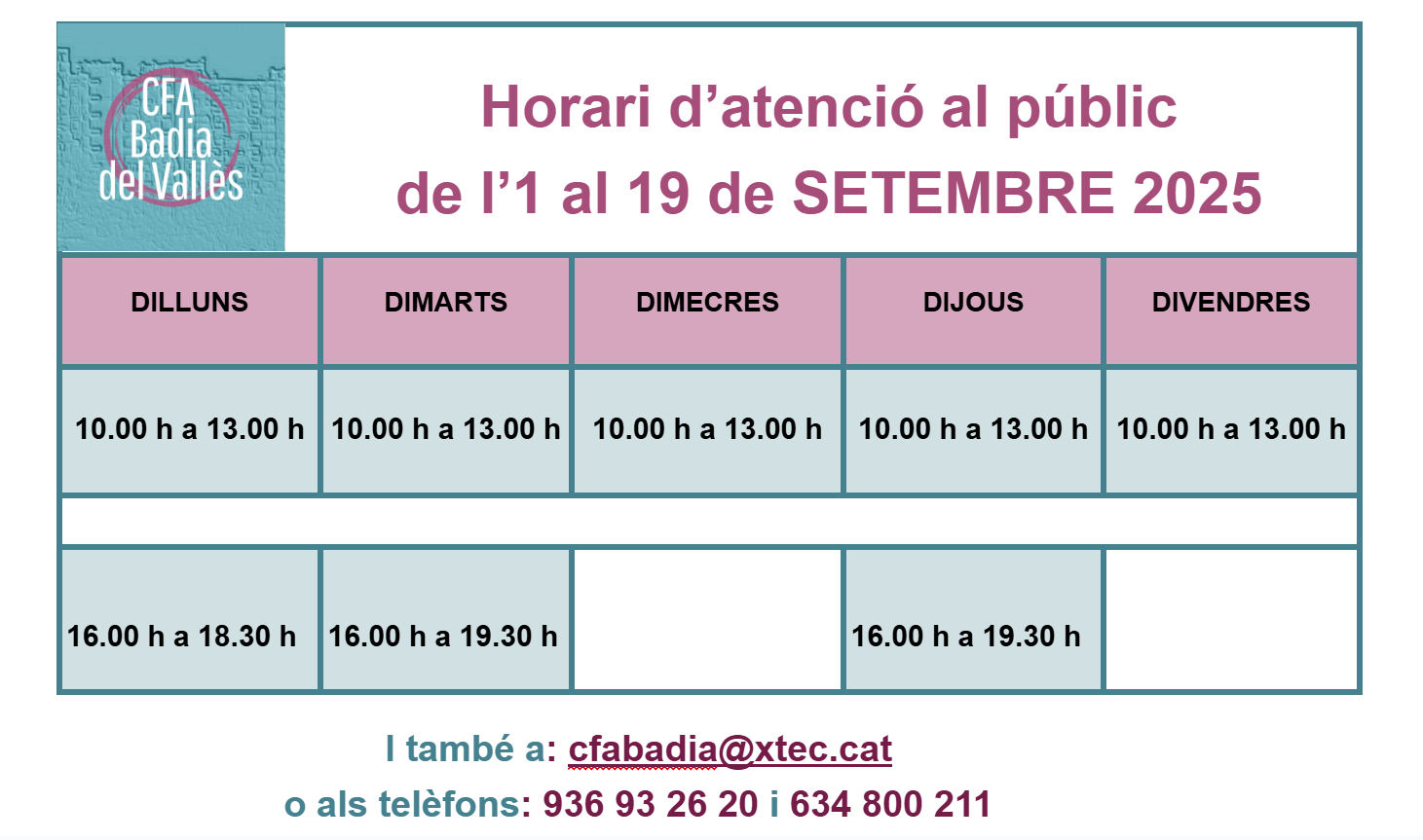 Si no pots venir en aquest horari, posa’t en contacte amb nosaltres trucant al 93 693 26 20 o enviant un correu a cfabadia@xtec.cat.