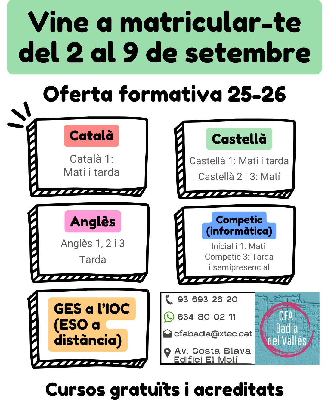 03/09/25- Preinscripció online (del 2 al 8 de setembre), omplint aquest formulari. Cal omplir totes les dades, triar el centre de suport (CFA Badia del Vallès) i pujar la documentació requerida.