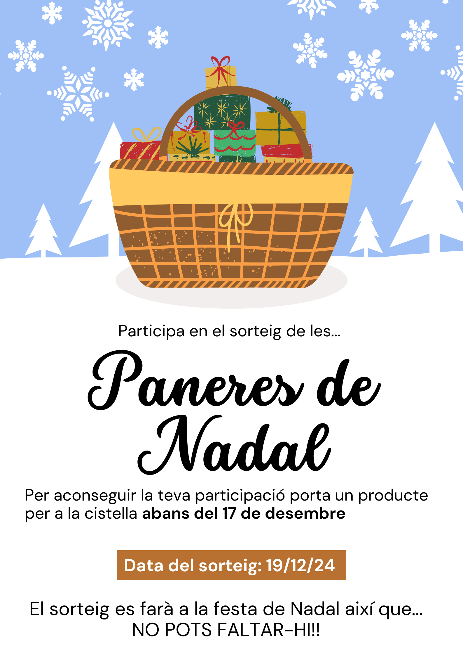 Hola a tots i a totes! Ens complau anunciar-vos que ja podeu participar en el sorteig de les paneres que es realitzarà a l’escola el dia de la festa de Nadal. El procediment és molt senzill: Porta a consergeria algun producte per emplenar les paneres, abans del proper 17 de desembre. L’escola et lliurarà un número […]
