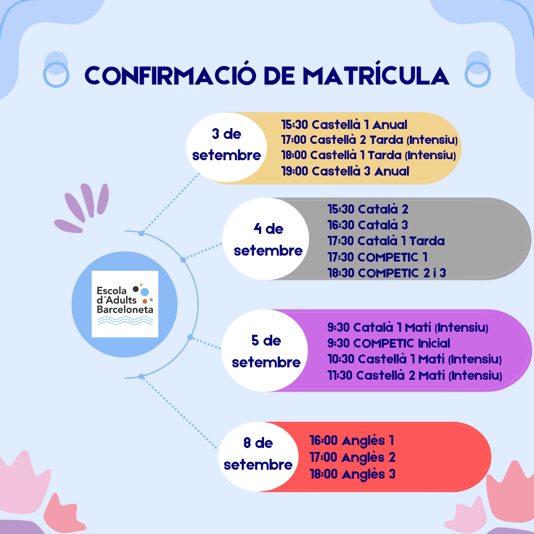 Benvolguts/des, Compartim amb vosaltres el calendari de confirmació de matrícula per al curs 2025/2026. És molt important que acudiu al centre el dia i hora establerts ja que, si no confirmeu la plaça, aquesta s’atorgarà a l’alumnat en llista d’espera. Bon estiu! CFA Barceloneta