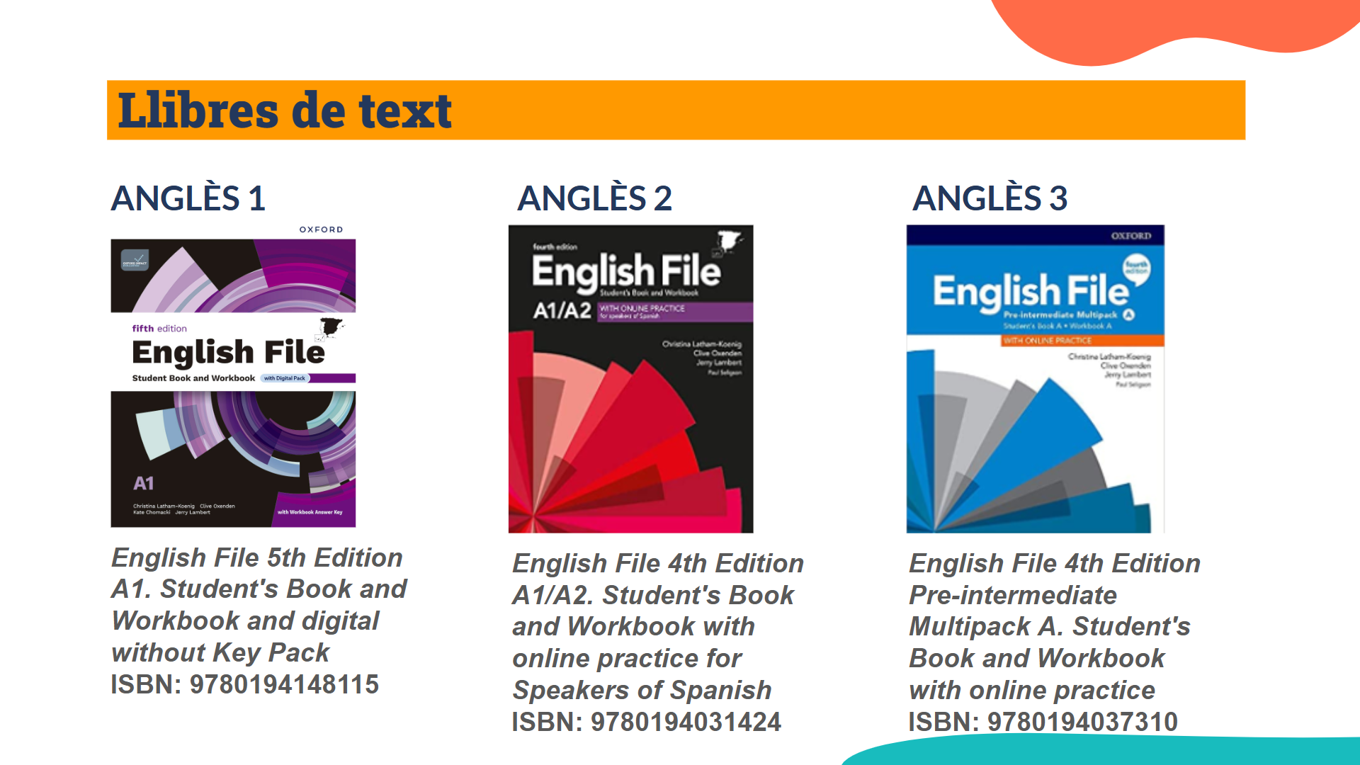 LLIBRES ANGLÈS Us recomanem que feu més cas de les fotografies de les cobertes dels llibres, dels títols, dels autors i l’editorial que dels números ISBN, ja que algunes editorials els canvien sovint.