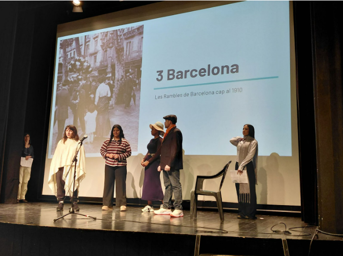 A continuació l’alumnat de GES 2 va representar “Coneixent els Bertrana”, unes escenes dramatitzades a partir d’alguns episodis de la vida de Prudenci i Aurora Bertrana, fruit d’un mes de treball a l’escola, individual primer i en grups cooperatius a continuació: recerca d’informació, selecció dels moments, escriptura, il·lustració amb imatges i assajos.