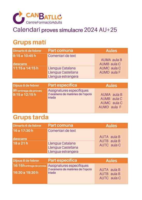 Aquesta setmana el dimarts 6 i el dijous 8 de febrer es faran al CFA Can Batlló les proves simulacre dels cursos d’accés al Cicle Formatiu de Grau Superior de la Formació Professional i dels cursos d’Accés a la Universitat per a majors de 25 i de 45 anys.