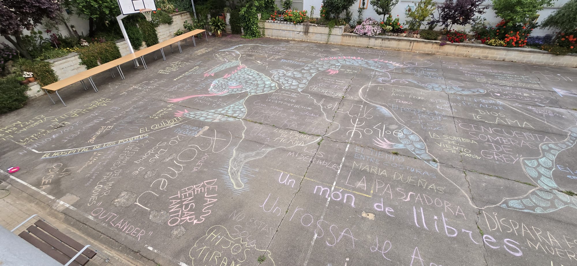 El dia 23 d’abril, el pati de l’escola es va convertir en un espai molt especial. Un gran drac dibuixat a terra sota el perfil dels continents va esdevenir l’escenari perfecte perquè cadascú hi deixés per escrit el seu llibre recomanat.