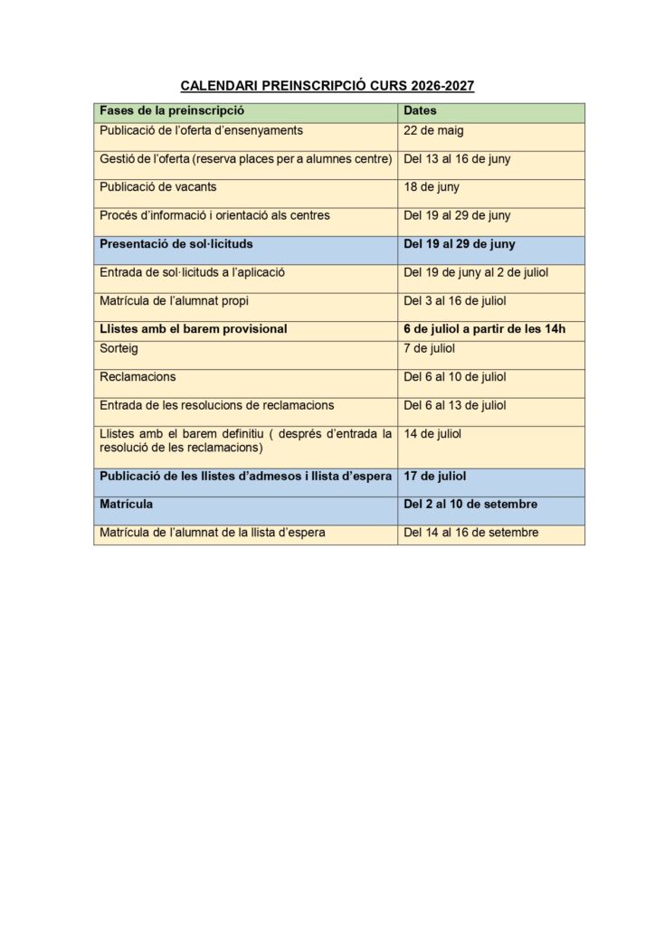 El 23 de març de 2026 es va publicar la Resolució EDF/814/2026 de 19 de març per la qual es determinen el calendari i les condicions de la preinscripció i matrícula per al curs 2026-2027 , entre d’altres, per als ensenyaments impartits en centres i aules de formació d’adults. En la següent taula, trobareu les diferents fases de la preinscripció.