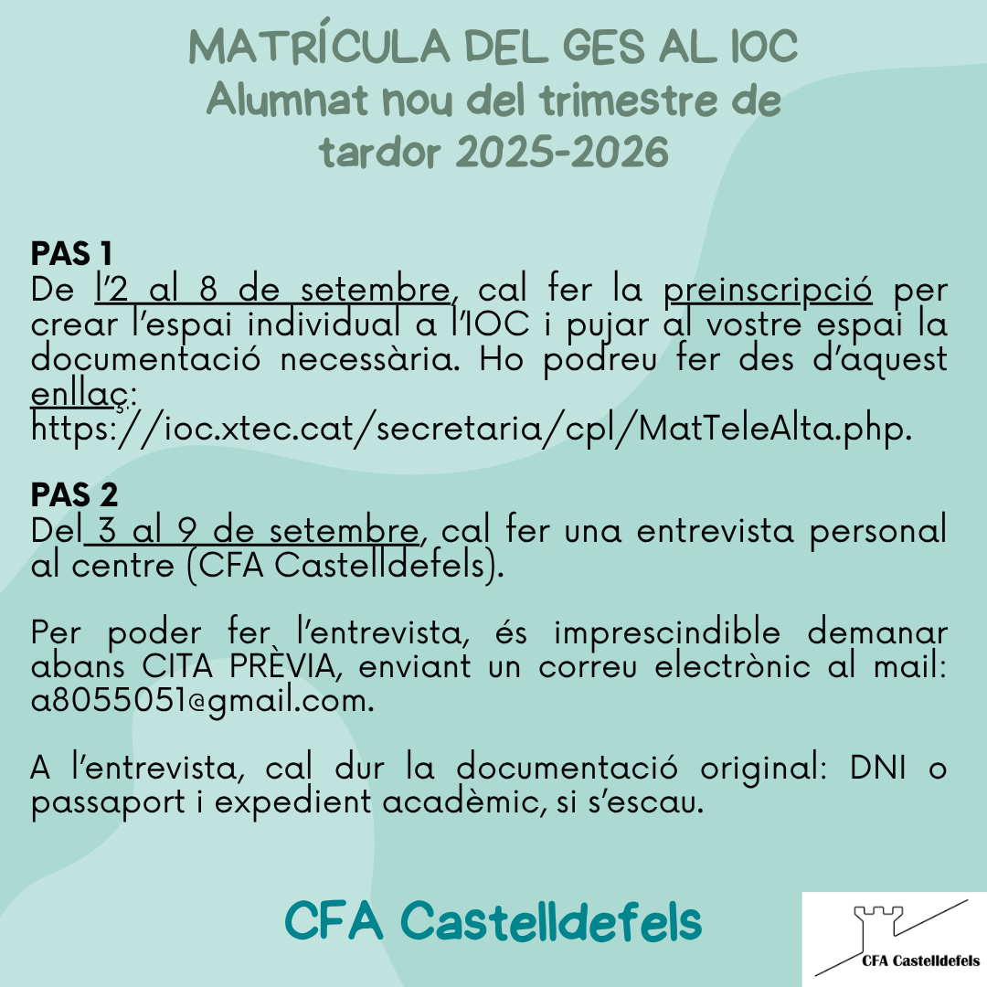 Dates de matrícula al IOC Feu un comentari / Per admin / 07/07/2025 / Ajuntament coeducació educació General GES Portada Si t’interessa cursar el GES mitjançant el IOC, les dates de preinscripció i matrícula al setembre de 2025 es detallen a continuació: