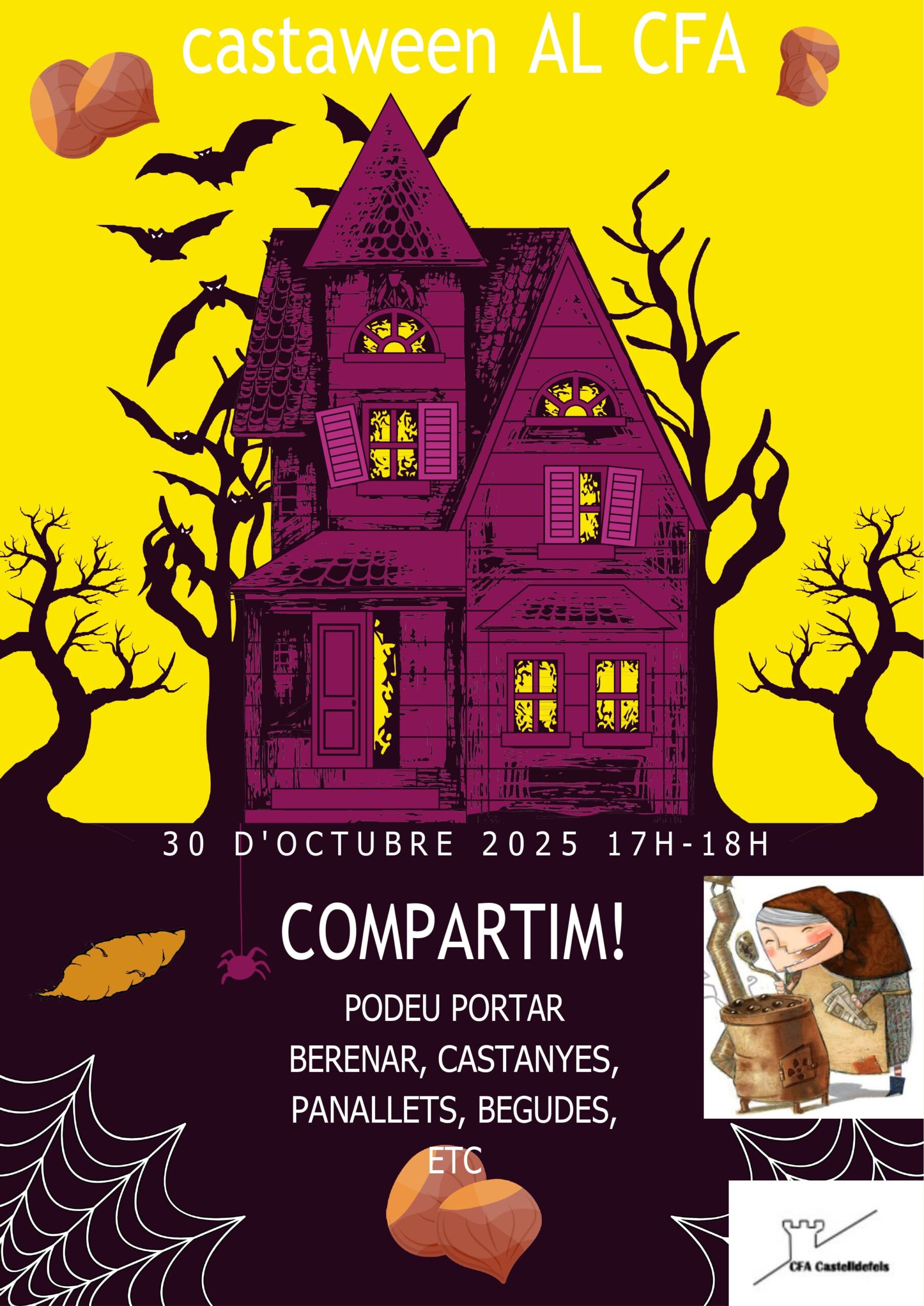 Festa de Castaween al CFA Castelldefels Feu un comentari / Per admin / 20/10/2025 / Ajuntament Au+25/45 Castellà Català CFGS coeducació Competic educació English Français General GES Portada El dijous 30 d’octubre a les 17h celebrarem la festa de Castaween al CFA Castelldefels. Podeu portar berenar, farem xocolatada!