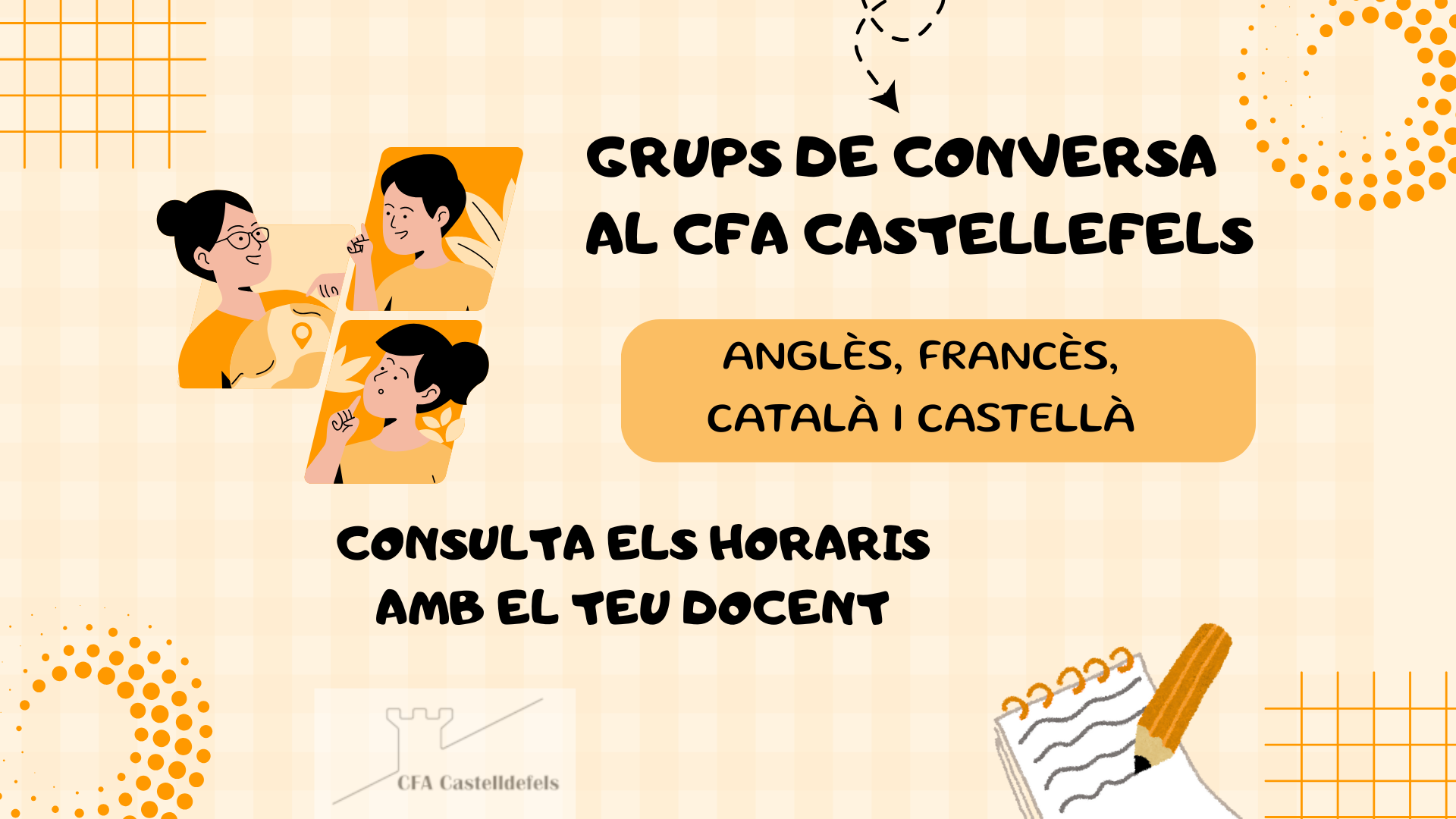 Grups de conversa Feu un comentari / Per admin / 02/10/2025 / Au+25/45 Castellà Català CFGS coeducació Competic educació English Français General GES Portada Aquest curs reiniciem els grups de conversa al CFA Castelldefels per l’alumnat del centre.