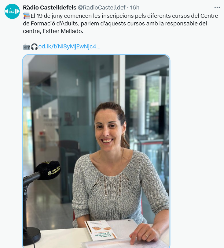 Ràdio Castelldefels anuncia les preinscripcions Feu un comentari / Per admin / 05/06/2025 / Ajuntament Au+25/45 Castellà Català CFGS coeducació Competic educació English Français General GES Muralla Digital Revista Portada El 19 de juny comencen les inscripcions pels diferents cursos del Centre de Formació d’Adults, parlem d’aquests cursos amb la responsable del centre, Ester Mellado.
