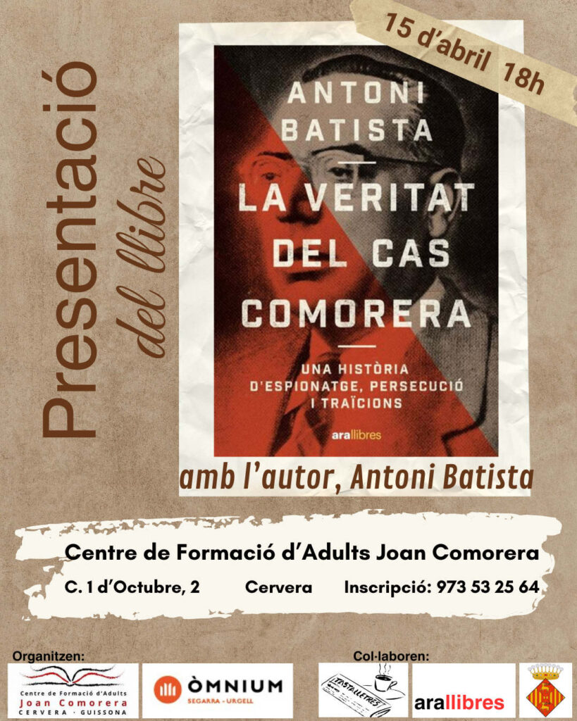 Des del CFA Joan Comorera us convidem a una tarda molt especial amb la presentació del llibre La veritat del cas Comorera, amb la presència del seu autor, Antoni Batista.