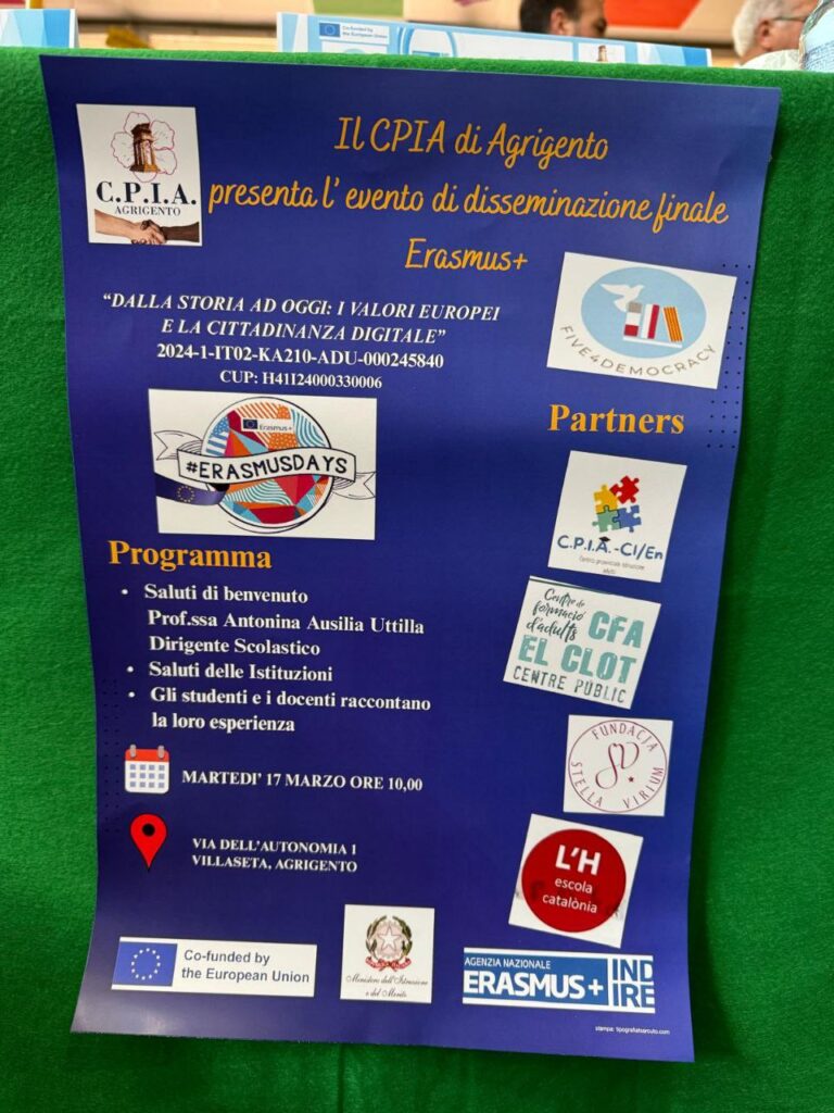 Just aquesta setmana ha finalitzat el projecte Erasmus internacional amb Itàlia i Polònia en el qual participem des de fa més d’un any. Dues professores han anat a Sicília a les jornades de treball que han suposat la cloenda del projecte sobre dictadura i democràcia que han anat treballant els estudiants d’anglès 2 i anglès 3. Hem col·laborat amb una escola d’adults d’Agrigento i una altra de Caltassinetta, totes dues a Sicília, amb el CFA Catalònica de L’Hospitalet i amb un altre centre de la ciutat polaca de Cracòvia.
