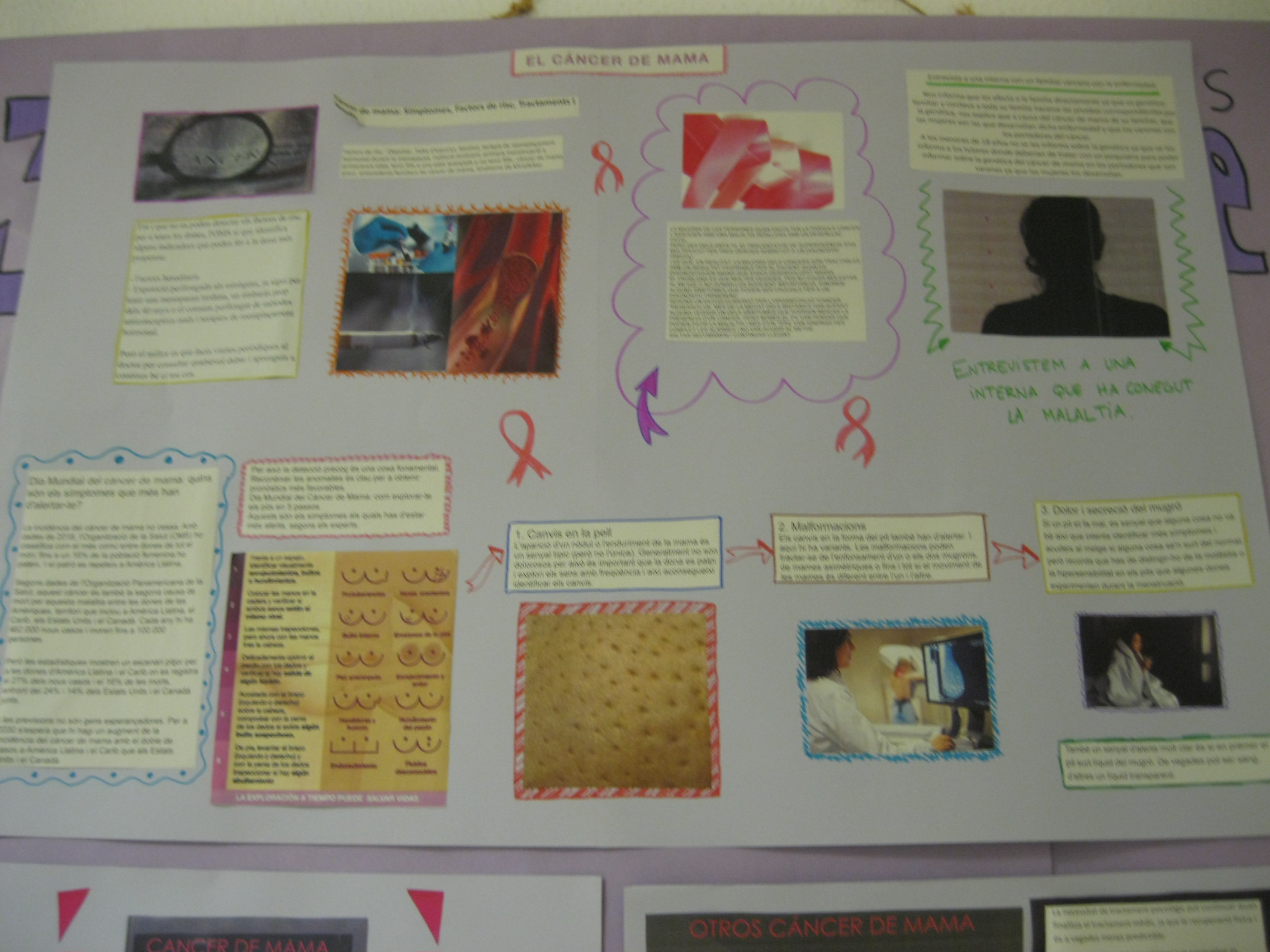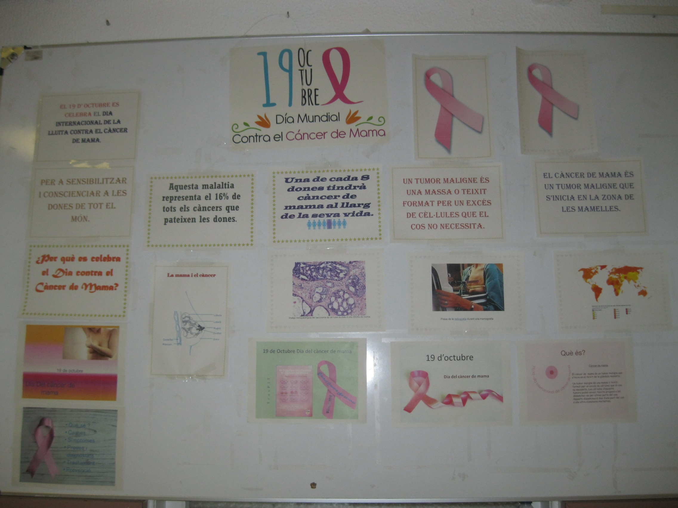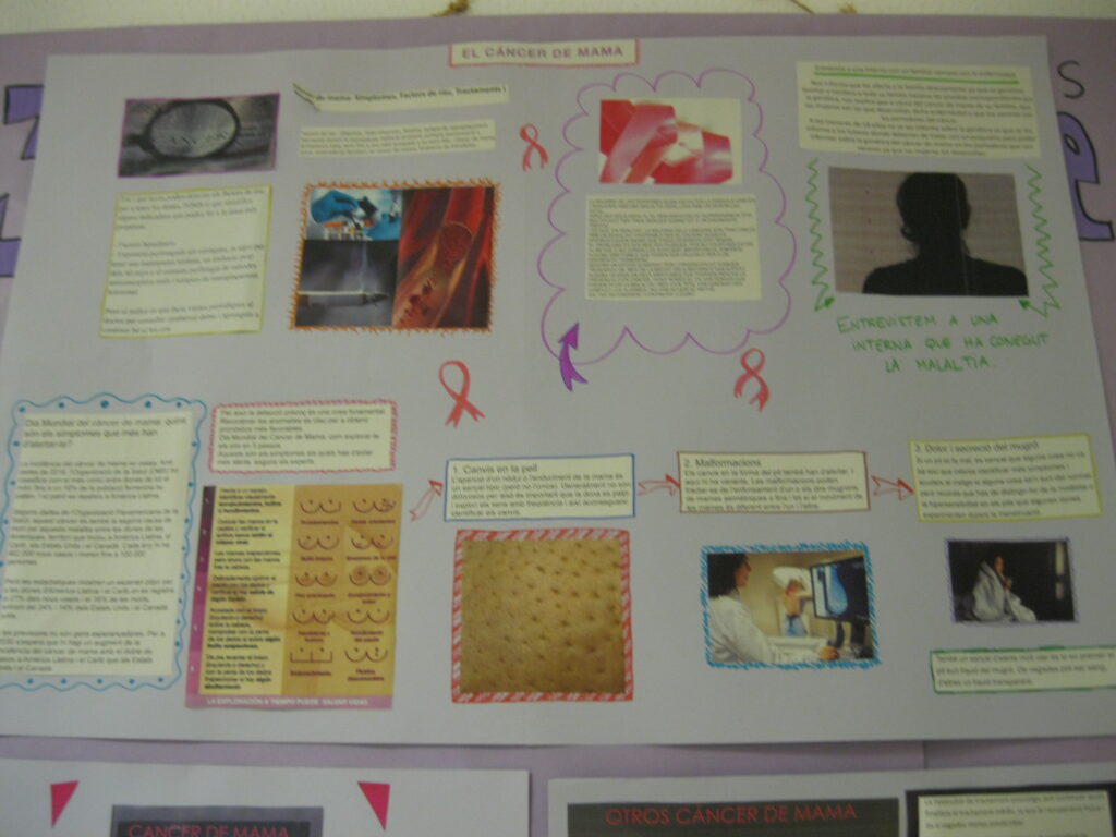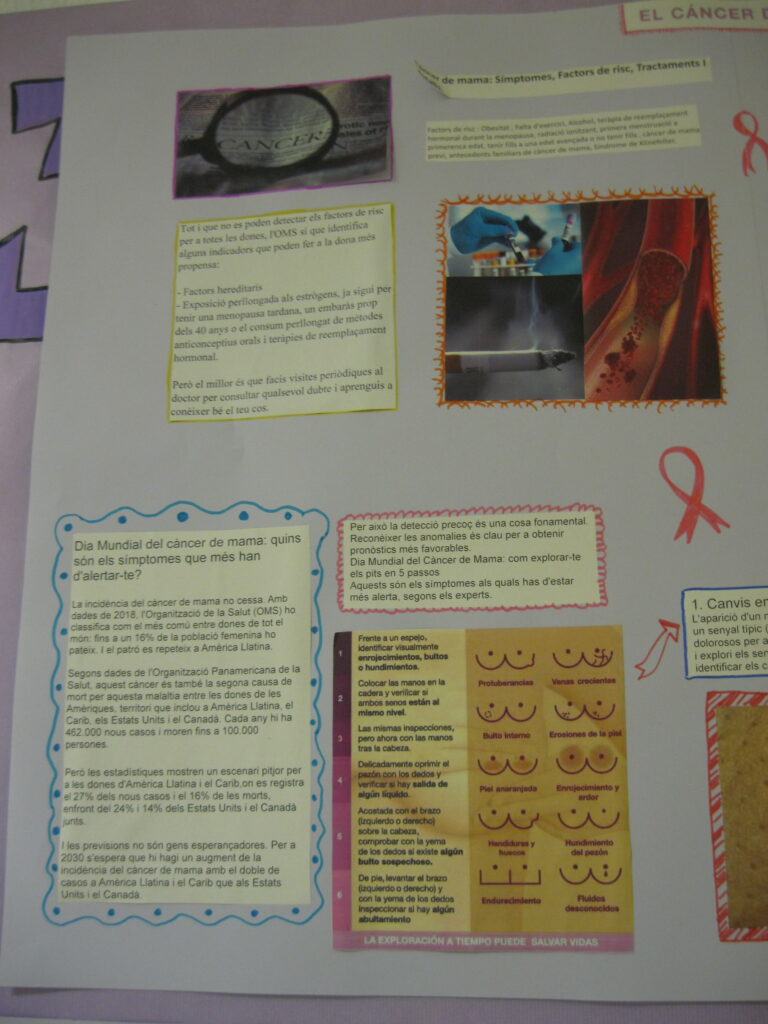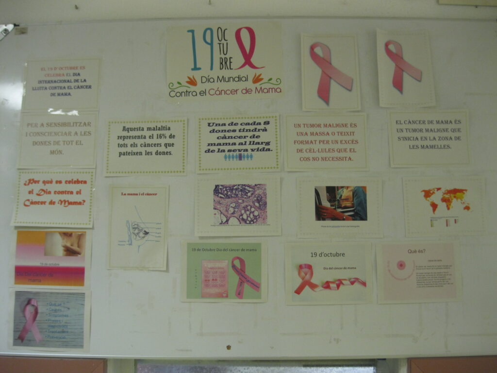 A classe s’han tractat temes com la detecció i símptomes, el tractament, l’acompanyament de les persones que el pateixen, la reproducció i fertilitat femenines, etc. A més, les alumnes de FI3 i FI4 han elaborat uns murals on poder veure tota la informació relacionada amb aquest dia.