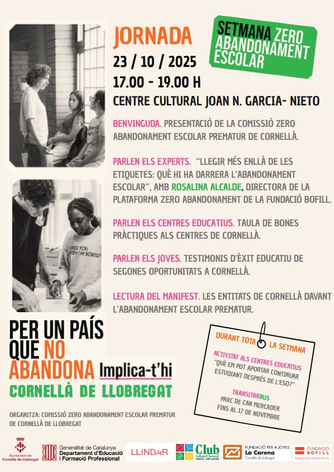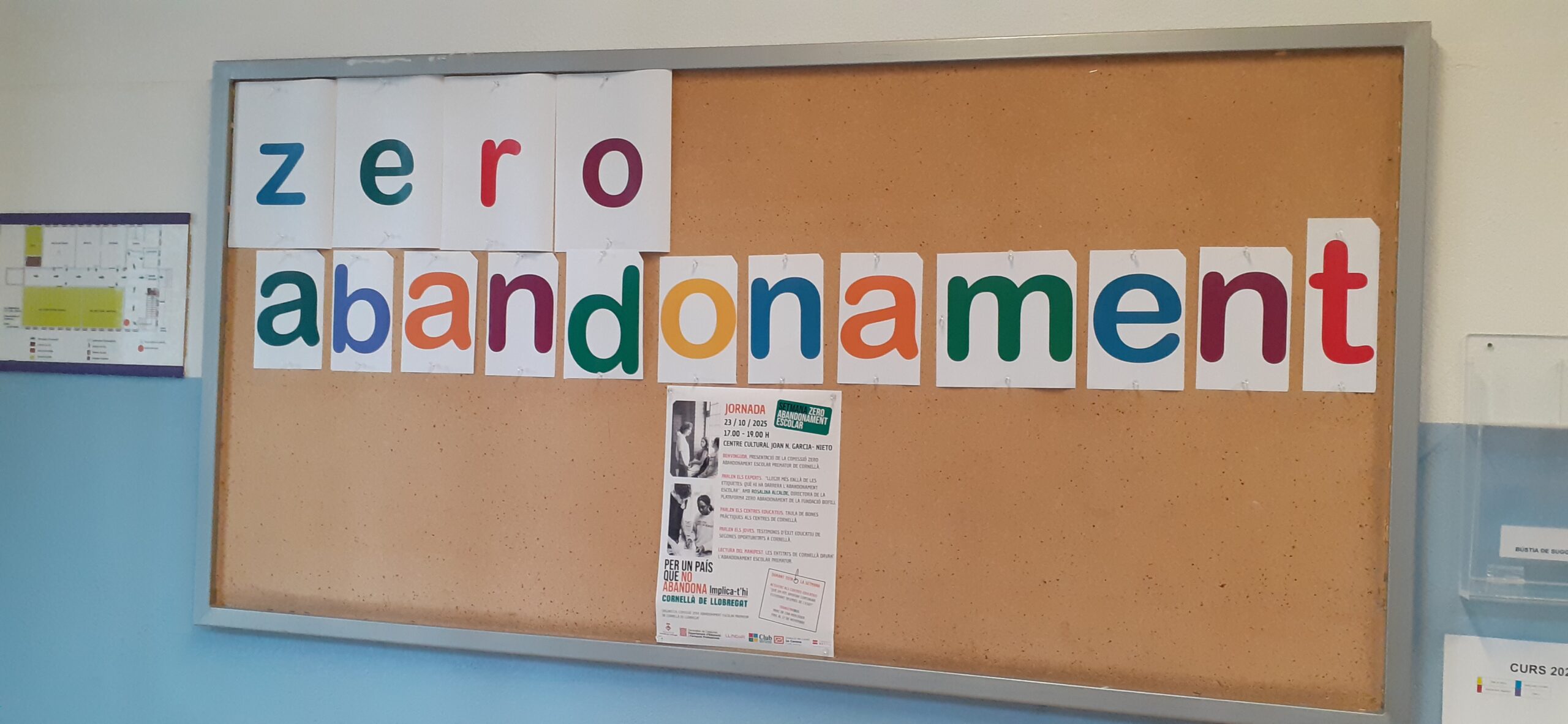 20/10/25La Comissió Zero Abandonament ha preparat diverses activitats en el marc de la Setmana Zero Abandonament, per impulsar la lluita contra l’abandonament escolar a tots els centres educatius de la ciutat. Durant tota la setmana, els diversos grups-classe ens preguntarem “Què em pot aportar continuar estudiant després de l’ESO?”, omplirem el suro amb les respostes de cada persona i també participarem en la trobada organitzada a tal efecte a la Biblioteca Central de Cornellà. Per un país i una ciutat que no abandona, implica-t’hi! 🔥💪