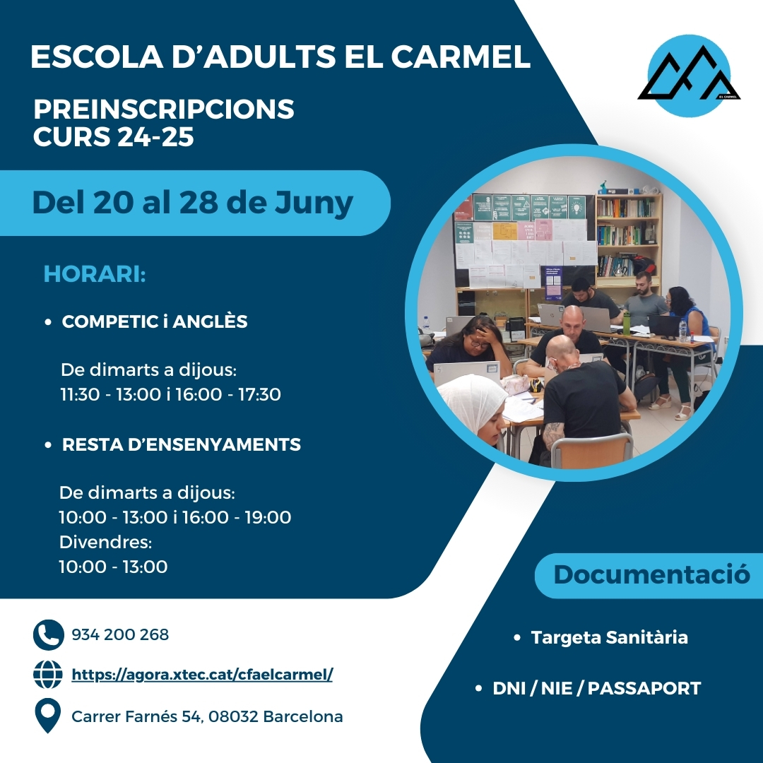 Places vacants i horaris preinscripció cursos 24-25Per admin / 18/06/2024 / Portada PREINSCRIPCIÓ A CENTRES I AULES DE FORMACIÓ DE PERSONES ADULTES. OFERTA D’ENSENYAMENTS. CURS 2024 / 2025