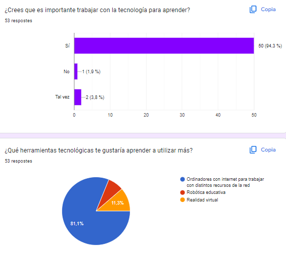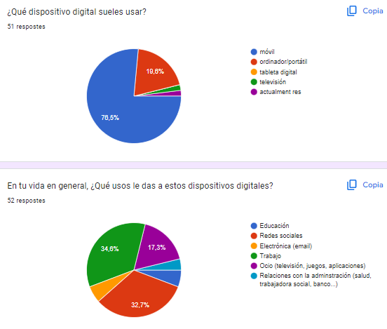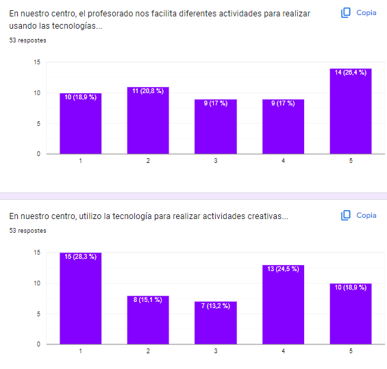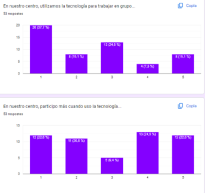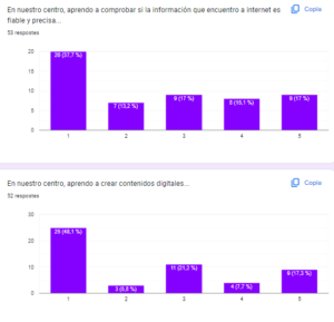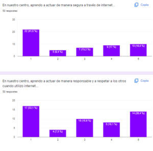 Google forms: es tracta d’un software d’administració d’enquestes que inclou el Google Docs Editors, de manera gratuïta. En el nostre cas, l’hem utilitzat per passar-lo a l’alumnat, construint una nova enquesta que emergeix de la de Selfie per alumnes i, també, elegint i modificant algunes preguntes per tal que s’adaptessin més a la realitat i necessitats de l’alumnat: preguntes traduïdes al castellà, preguntes més simplificades per tal d’arribar a tots els nivells educatius i canvi d’algun vocabulari tecnològic per altres que puguin entendre persones d’un nivell socioeconòmic baix.
