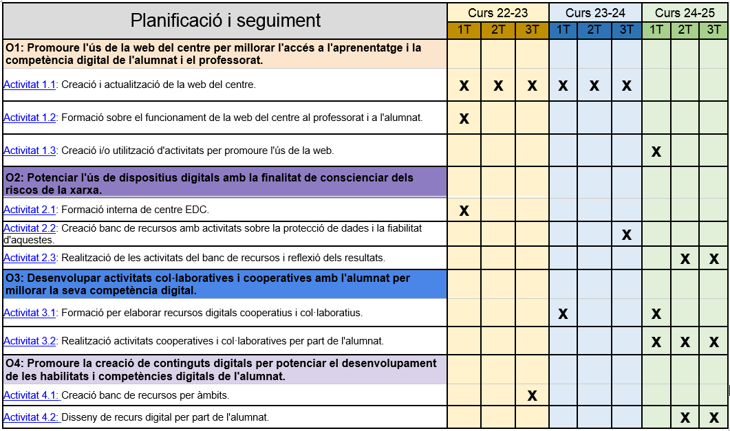 Per tal d’aconseguir els objectius s’han dissenyat les següents activitats que es duran a terme els cursos 2022-23, 2023-24 i 2024-25: