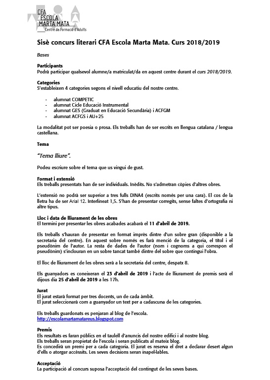 Bases del sisè concurs literari CFA Escola Marta Mata Llegeix més »