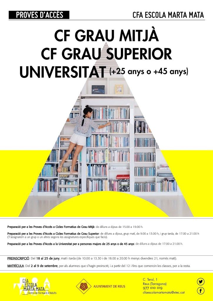 Vols cursar estudis universitaris i tens més de 25 anys o més de 45 anys? Del 18 al 25 de juny s’obre el període de preinscripció. Consulta els horaris: aquí Curs de preparació per a l’accés a la universitat per a majors de 25 i 45 anys Truca’ns al 977 010 019 o fes arribar un mail