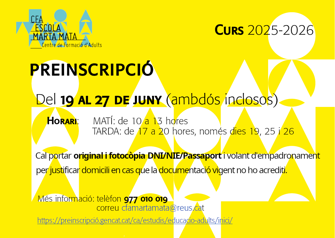 Del dimarts 19 al 27 de juny, preinscripció als ensenyaments d’adults. Pel matí de 10:00 a 13:00 hores i per la tarda de 17:00 a 20:00 hores. Recordeu que els dies 20, 23 i 27 només hi haurà preinscripció en horari de matí. Cal portar original i fotocòpia del DNI, NIE o passaport (no caducat) […]
