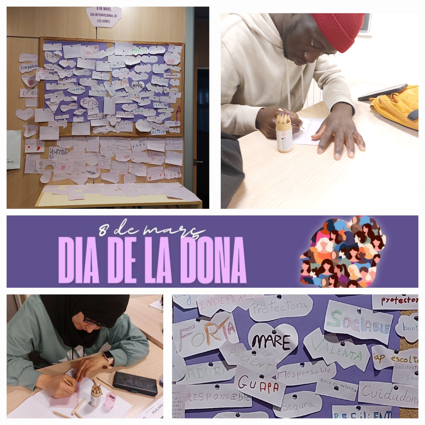 Amb motiu del Dia de la Dona, els alumnes d’alfabetització han treballat vocabulari relacionat amb la dona. Els alumnes del nivell inicial han escrit un adjectiu per descriure-la, i els del nivell 2 han redactat un petit text sobre la dona més important de la seva vida: unes paraules plenes d’estima i reconeixement.