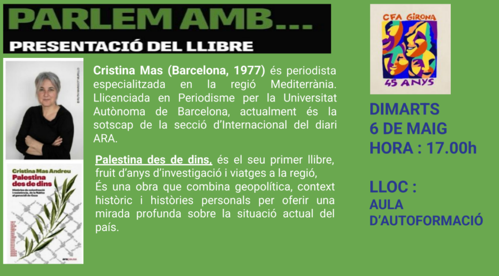Cristina Mas fa la presentació del llibre “Palestina des de dins” a l’escola Feu un comentari / Per admin / 30/04/2025 / Portada En el marc de la Setmana Freire, el dimarts, 6 de maig, la periodista Cristina Mas ens presenta el seu llibre Palestina des de dins.