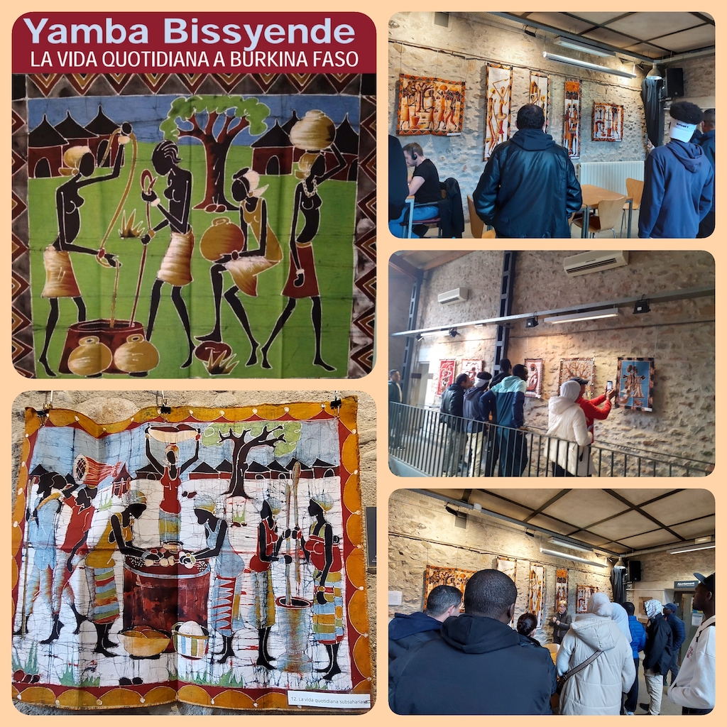 El passat dijous 27 de febrer l’alumnat de Formació Instrumental 1 de Santa Eugènia vam poder admirar l’exposició d’art tèxtil Africà de l’artista Yamba Bissyende, veí del barri. Totes les peces representaven la vida quotidiana dels homes i dones de Burkina Faso. La tècnica utilitzada s’anomena Batik i consisteix a estampar un teixit blanc amb colors i cera calenta.