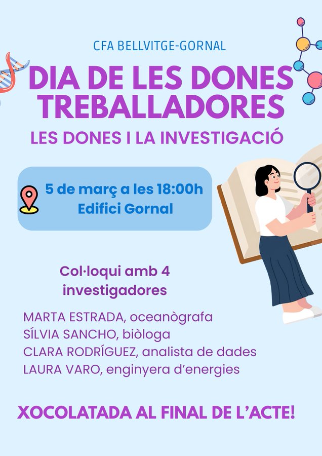 Commemorem el Dia de les Dones treballadores aquest proper dijous 5 de març a l’edifici Gornal. Podrem gaudir del col·loqui de les següents dones científiques: