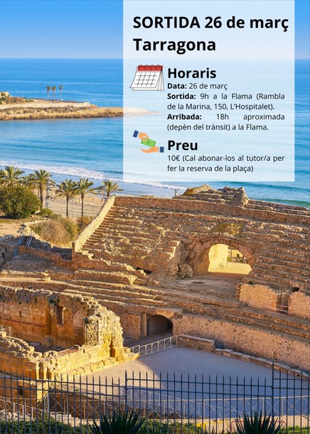 El proper dijous 26 de març anirem a Tarragona. Farem una visita guiada a la Tarragona romana, sortirem a les 9 del matí i tornarem aproximadament a les 6 de la tarda.