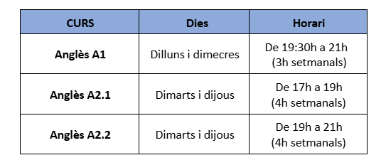 | Anglès 3 (A2.2) | 140 h | 4 h / setmana |