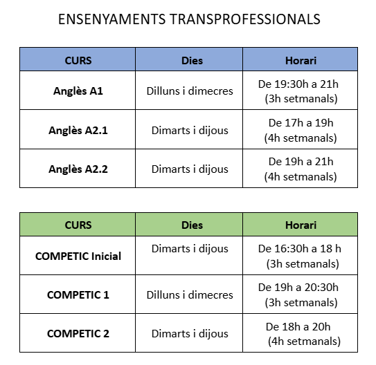| Anglès 2 (A2.1) | 140 h | 4 h / setmana |