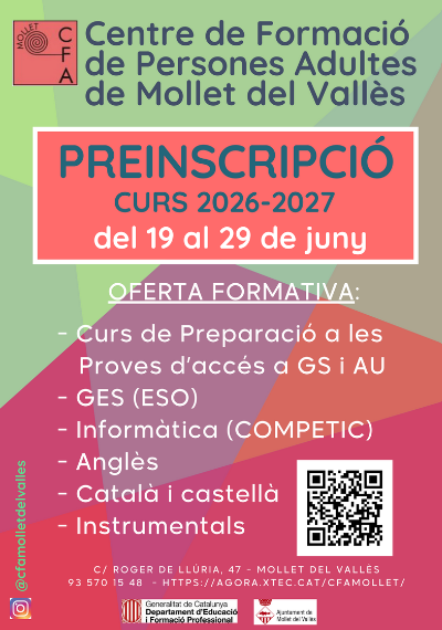Si vols estudiar anglès, o acabar els estudis de l’ESO, o potser, vols estudiar un grau superior o un grau universitari… Aquests són alguns dels estudis que oferim al nostre Centre de Formació d’Adults. Si tens dubtes de quan és la matrícula i en què… Llegeix més»